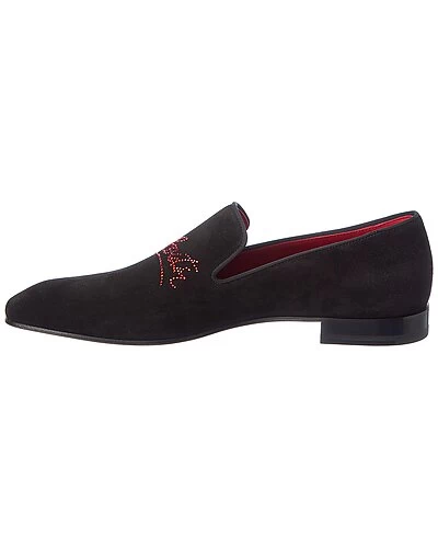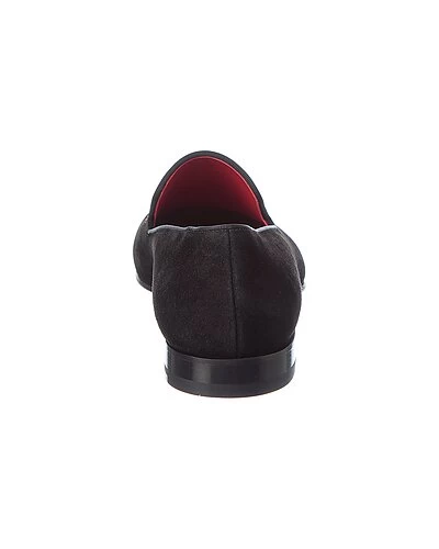 - Navy Dandelion Strass Suede Loafer in black suede with crystal-embellished logo and grosgrain trim