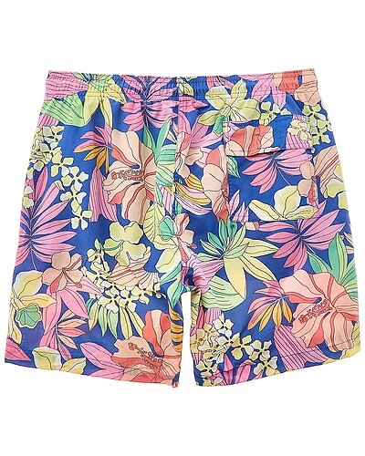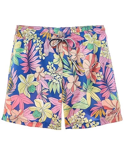 - Gibson Swim Trunk in blue multicolor with elasticized drawstring waist, dual front pockets, back right Velcro pocket and built-in mesh liner